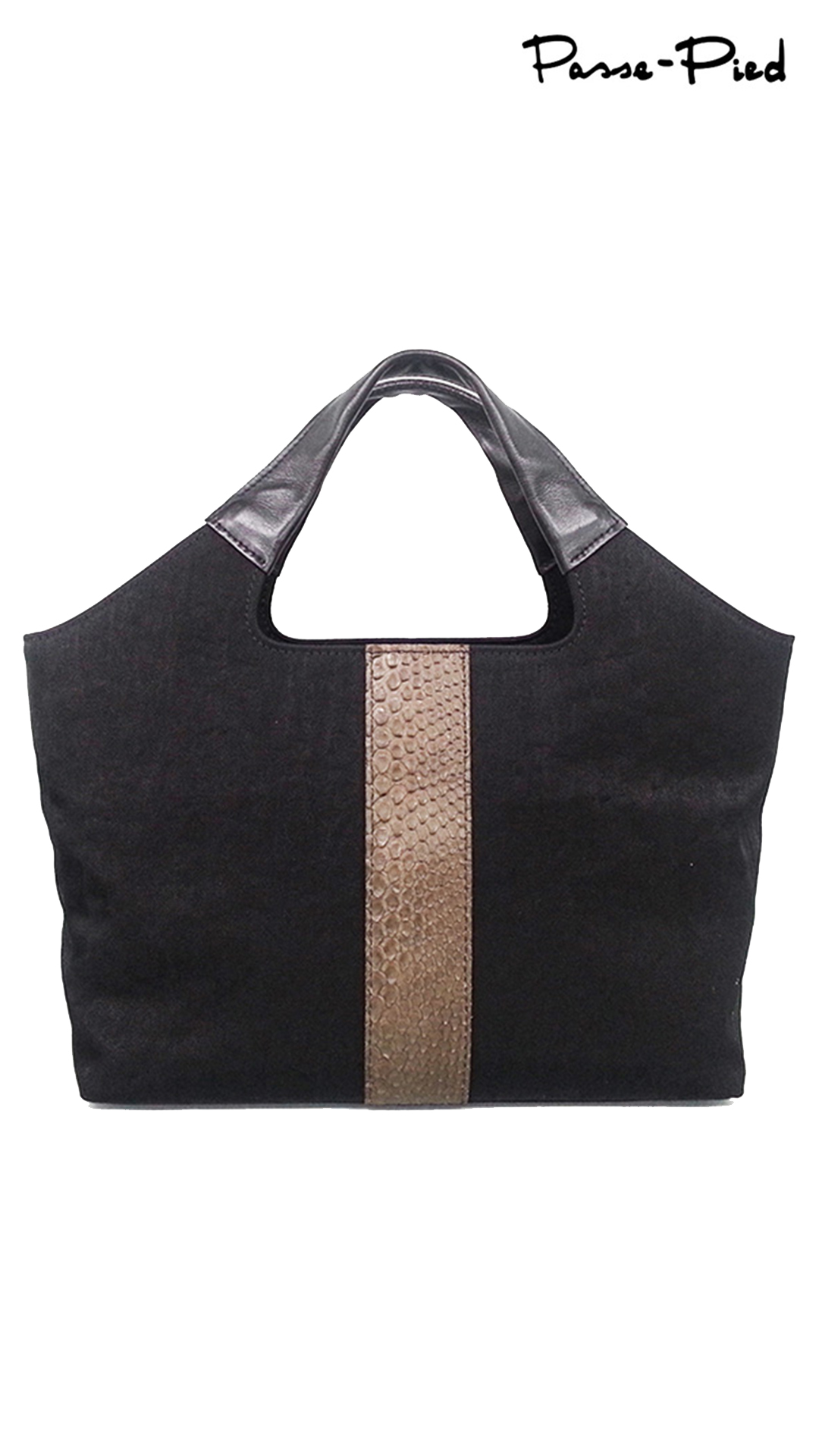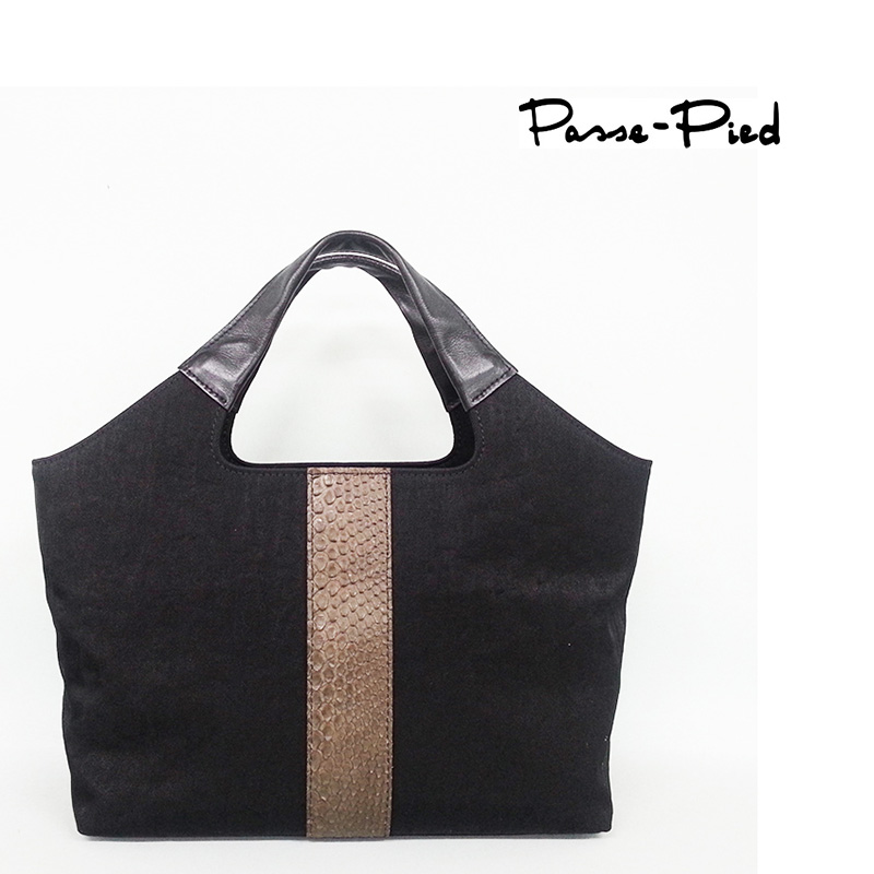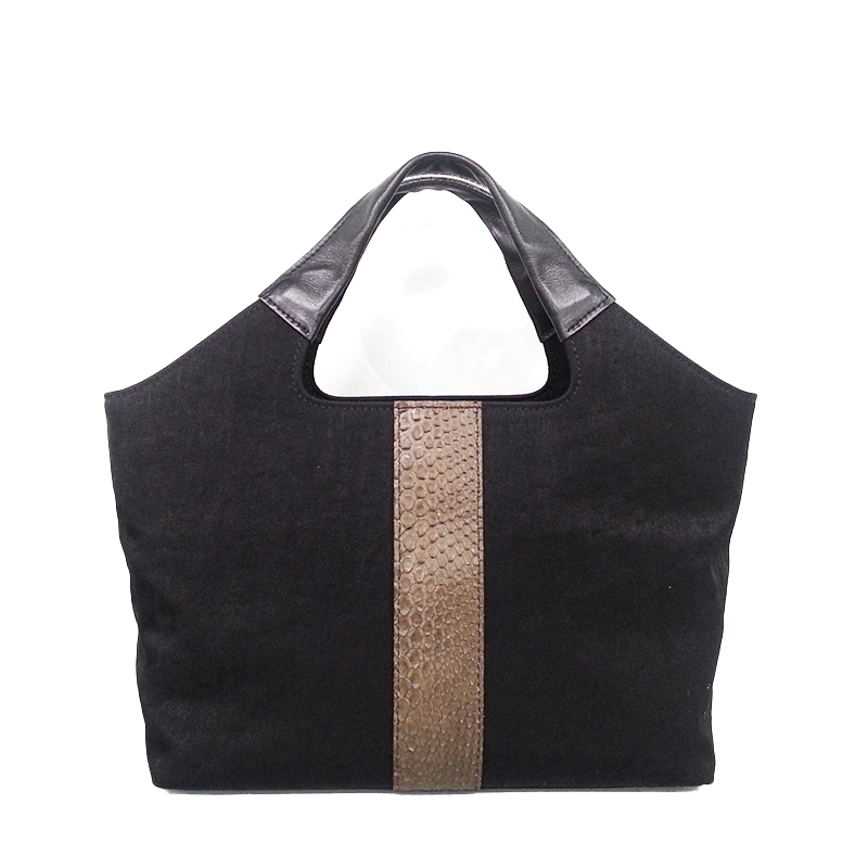 洗練されたフォルムに、前面にポイントとしてパイソン(ニシキヘビ)を使用した、ちょっと贅沢感のあるタウンバッグです。