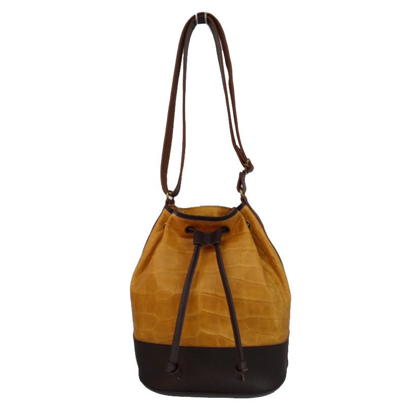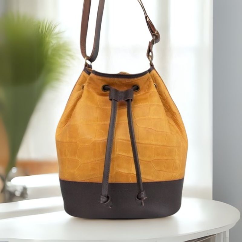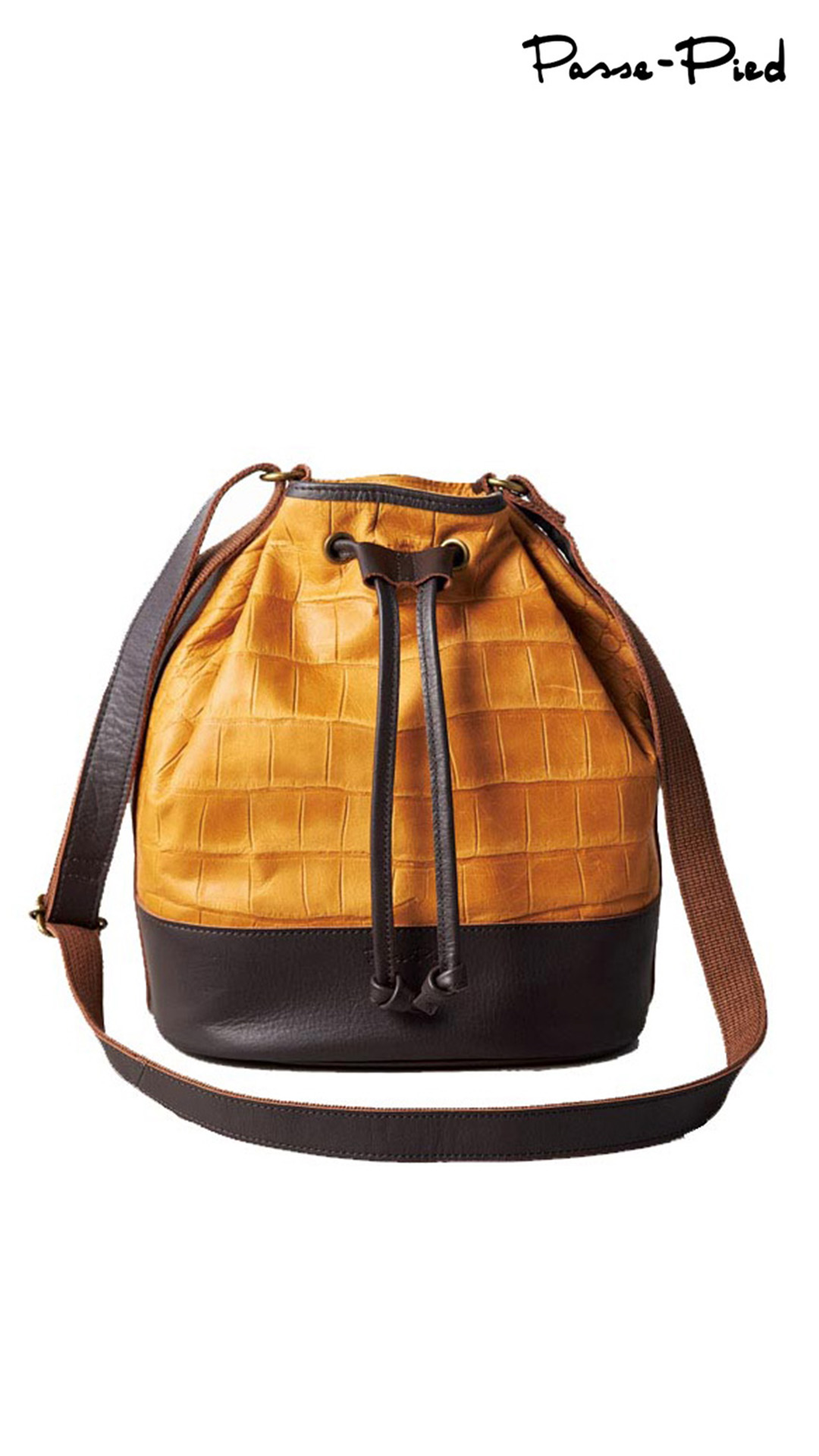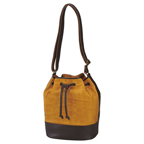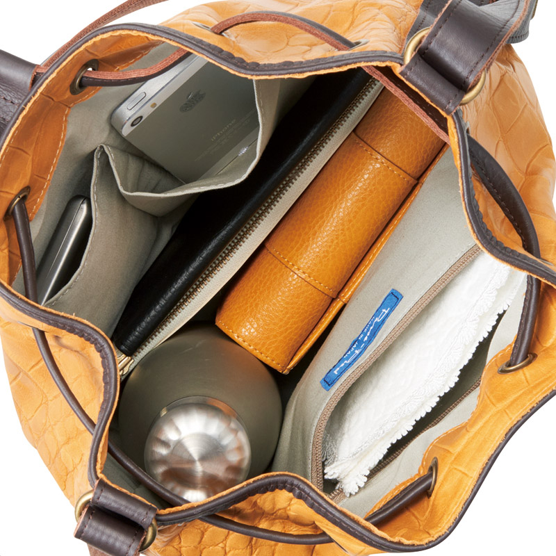 シックなキャメル×チョコのツートンカラーで洗練された雰囲気。クロコ調の型押しが施された本体は、使い込むほどに独特の味わいを増し、個性を引き立てます。