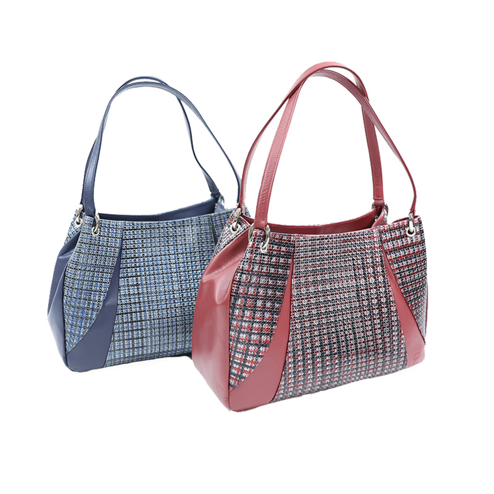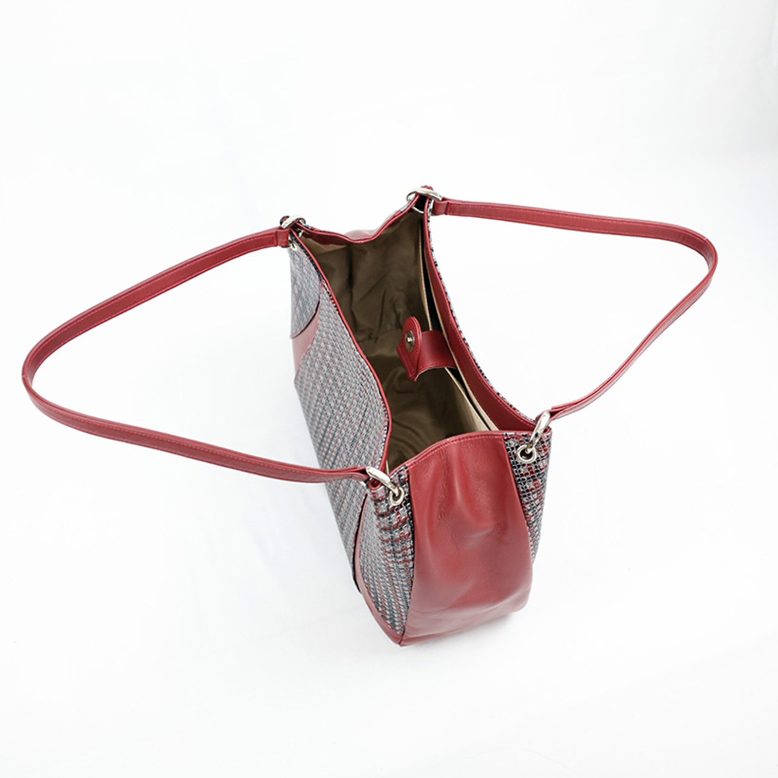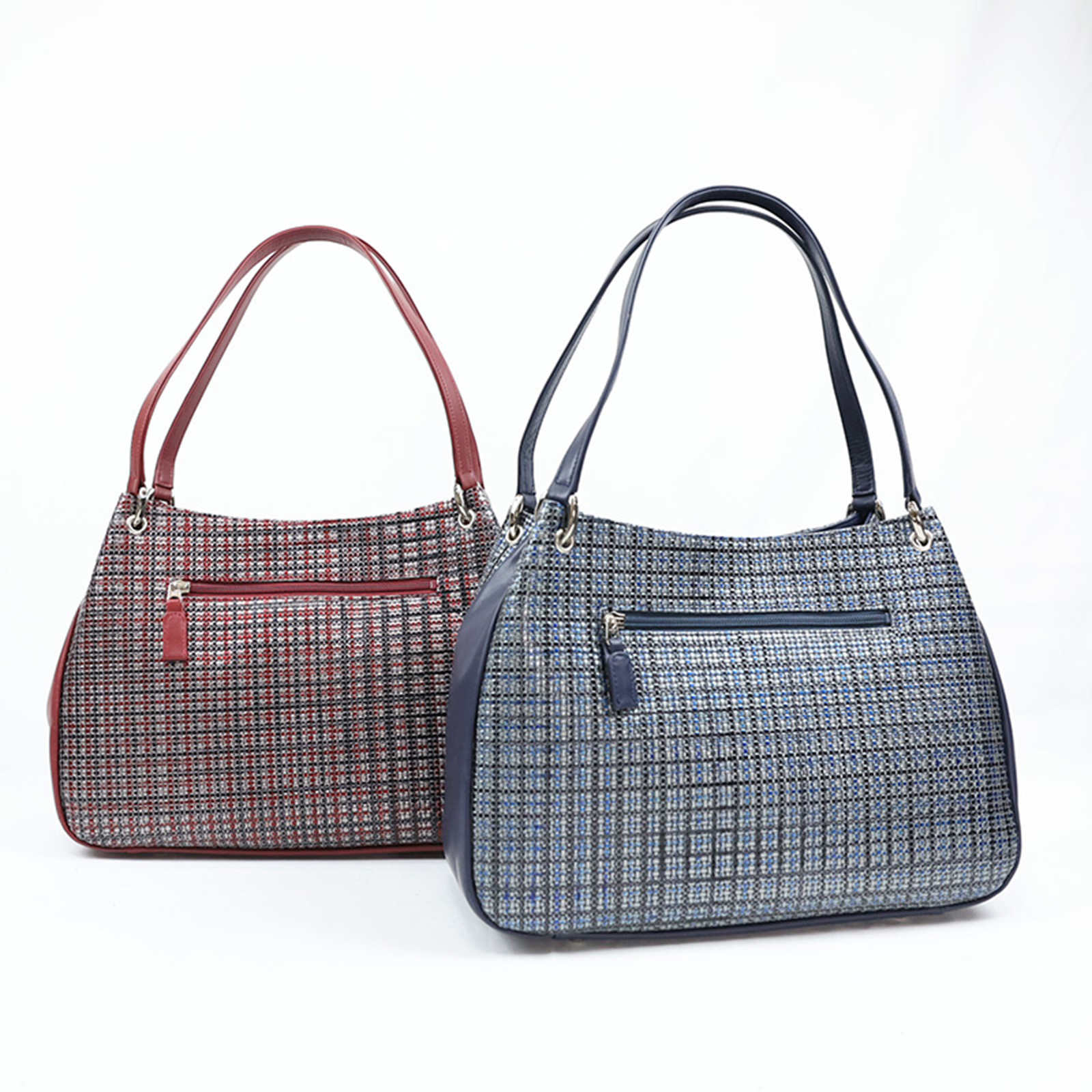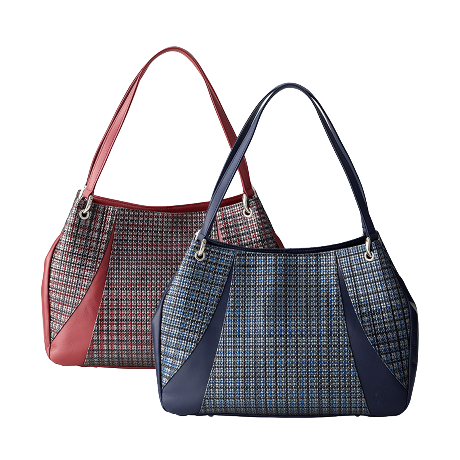 ・ チェック&スムースレザーの絶妙なバランス:編み込み風のチェック模様がオシャレ感をプラス