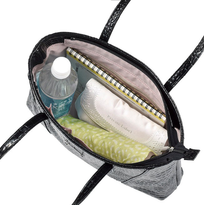 | ●機能 | ファスナー開閉式。内ファスナーポケット・外ファスナーポケット×各1、内オープンポケット×3。持ち手立ち上がり約18.5cm。 |