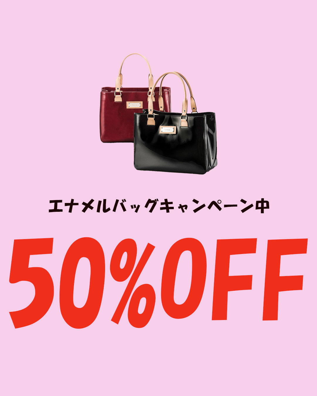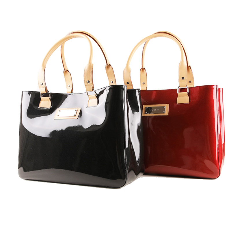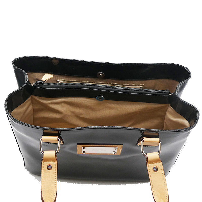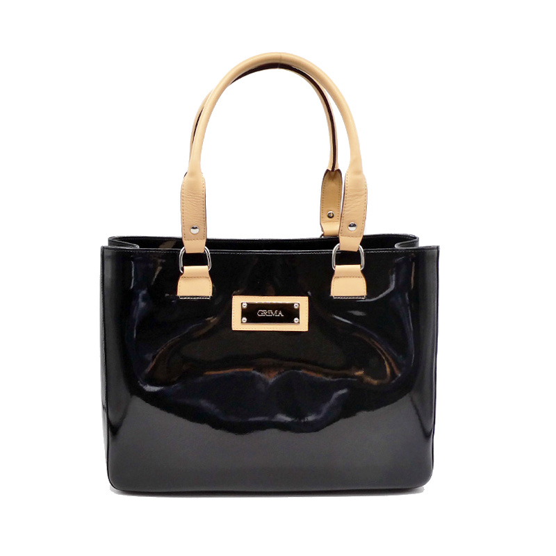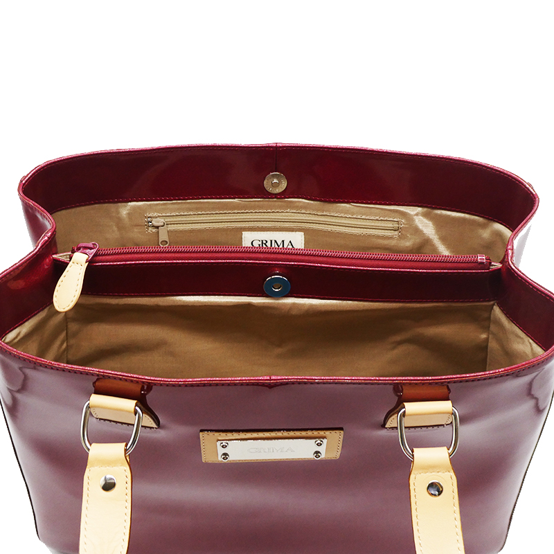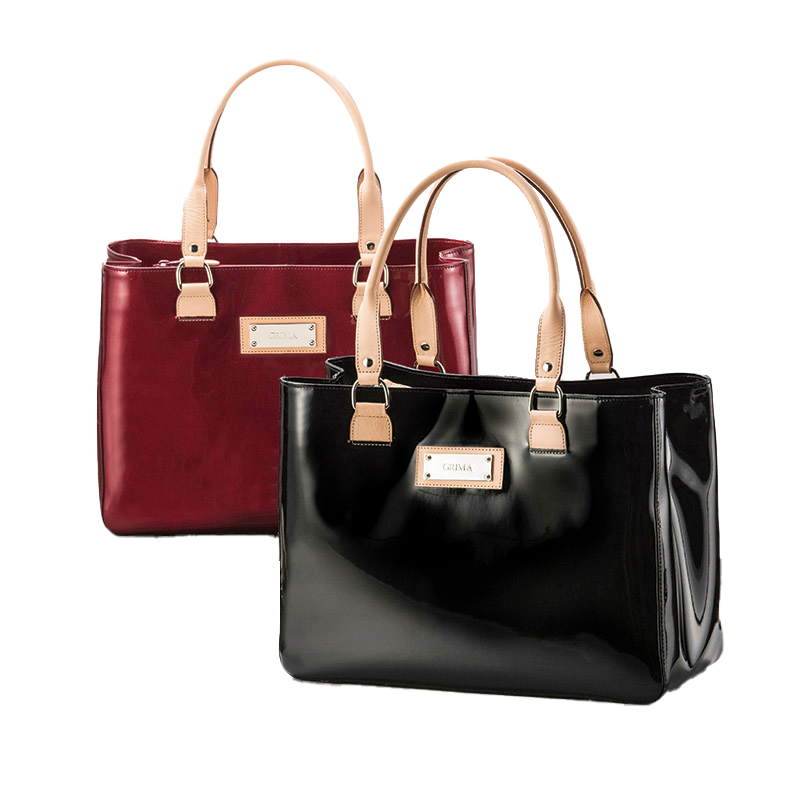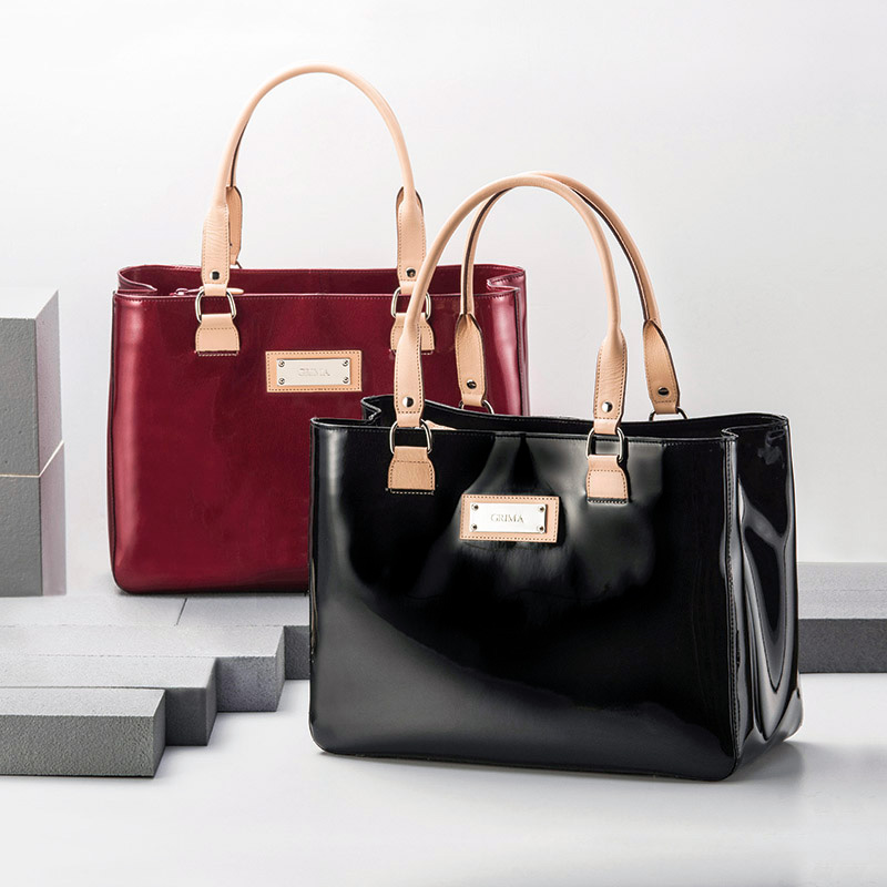 エナメル(合成皮革のエナメル加工)と明るい色(生成り)の牛革のコントラストがオシャレ。