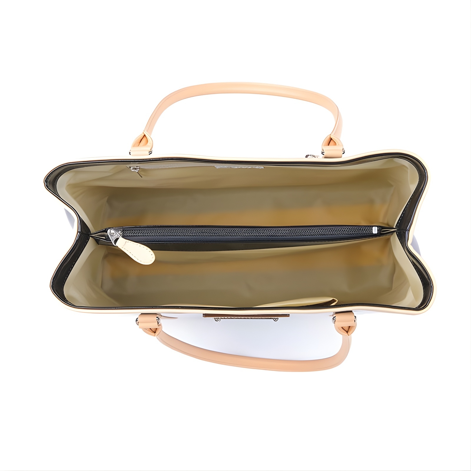 | ●機能 | 内仕切りを兼ねるファスナーポケット×1、内オープンポケット×2、内ファスナーポケット・外ファスナーポケット×各1。持ち手立上り約21cm。ショルダーストラップ着脱不可(長さ調節不可)。底鋲有。 |