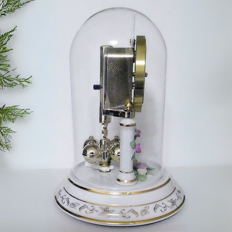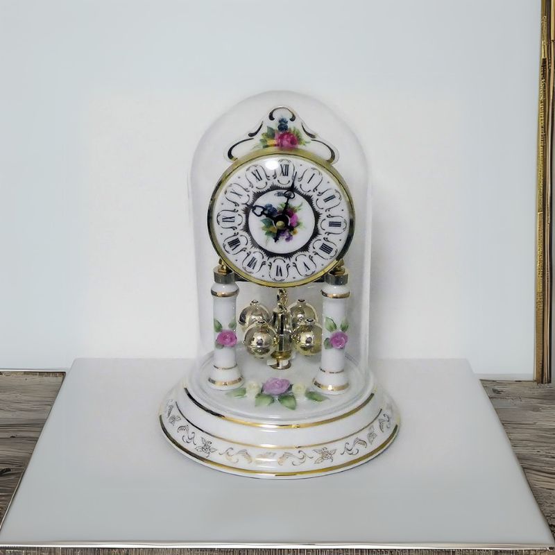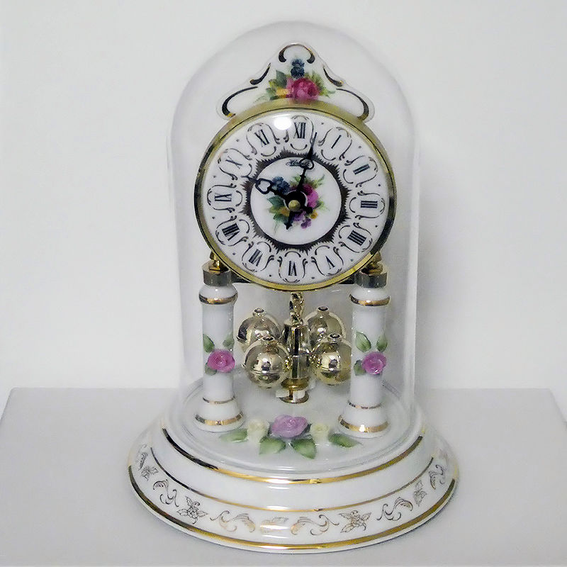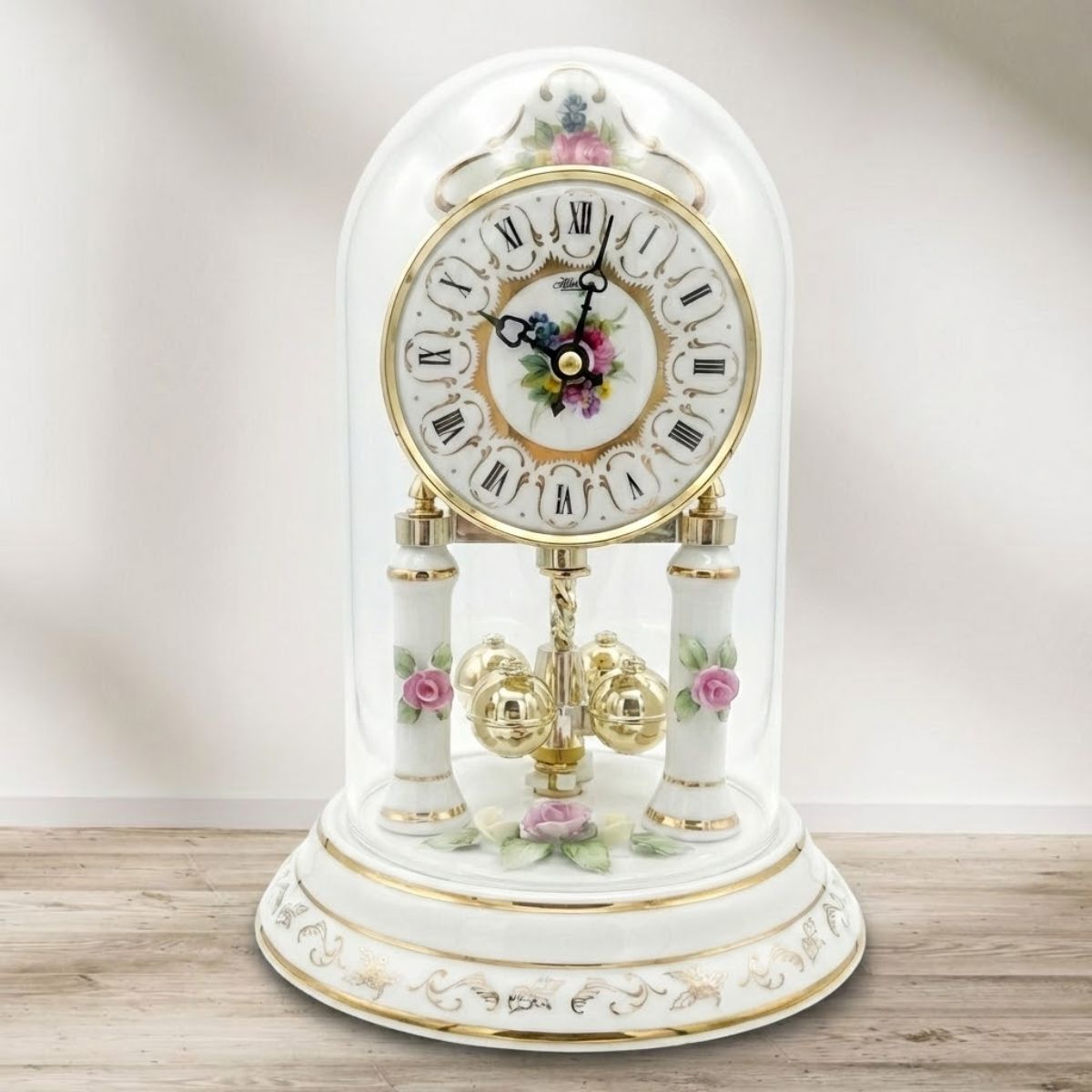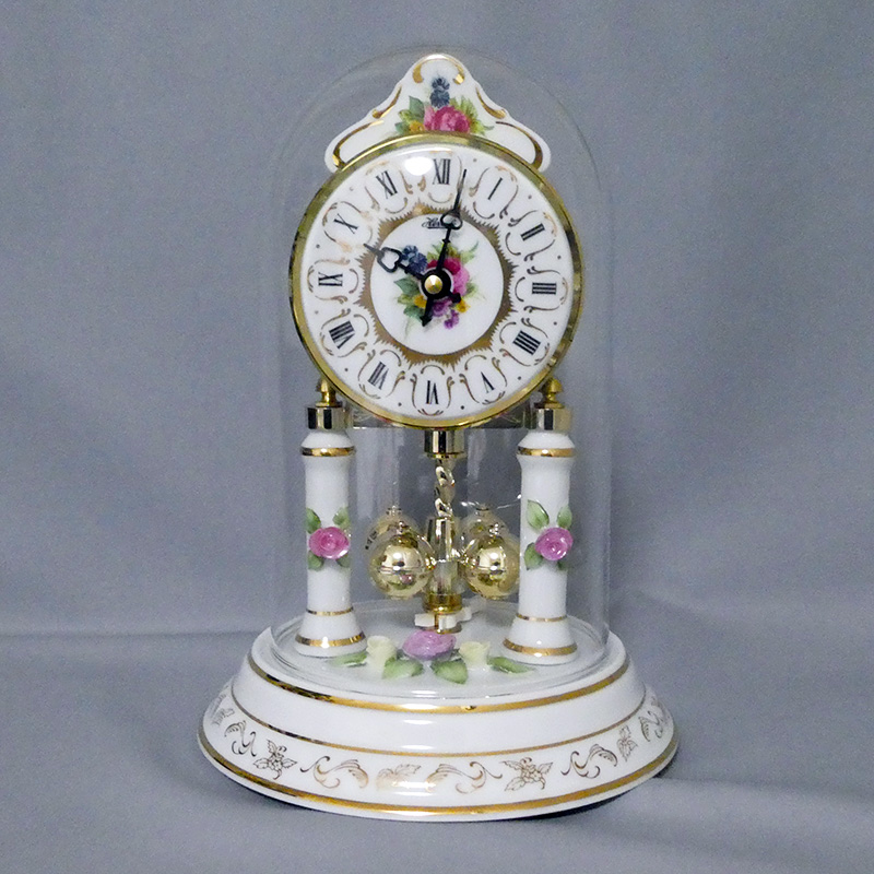 ヨーロッパの伝統的な時計作りを継承するドイツの名門「ヘルムレ」社より、名窯ドレスデンの磁器を贅沢にあしらった希少な置き時計をご案内いたします。純白の磁器に描かれた繊細な花々と、優美なゴールドの装飾が織りなす気高い佇まいは、まるで宮殿を飾る芸術品のよう。ガラスドームの中で静かに揺れる振り子を眺めるたび、慌ただしい日常を忘れ、心豊かな至福のひとときへと誘われます。