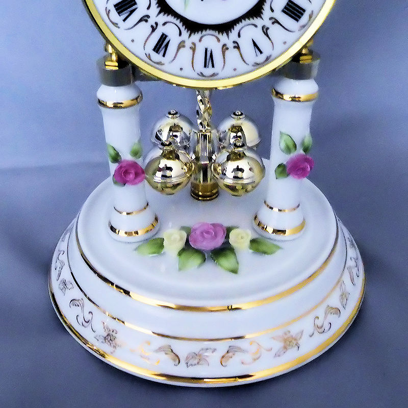 支柱や土台、文字盤の周囲に至るまで、美しいドレスデン磁器をふんだんに使用しています。職人の手による可憐な絵付けと、それを引き締めるゴールドの装飾が、置く場所をパッと華やかに彩ります。360度どこから見ても隙のない美しさは、ご自宅のインテリアを格上げする確かな価値をもたらします。