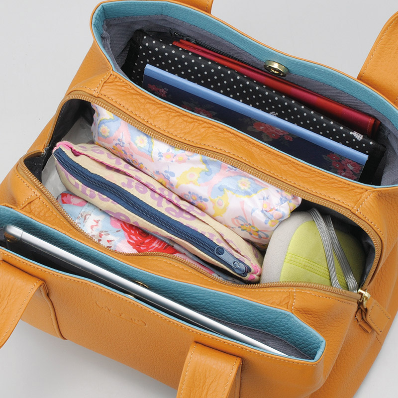 内側は、バッグの中の物が探しやすいように、明るい色(スカイブルー)のレーヨン生地を使用しています。