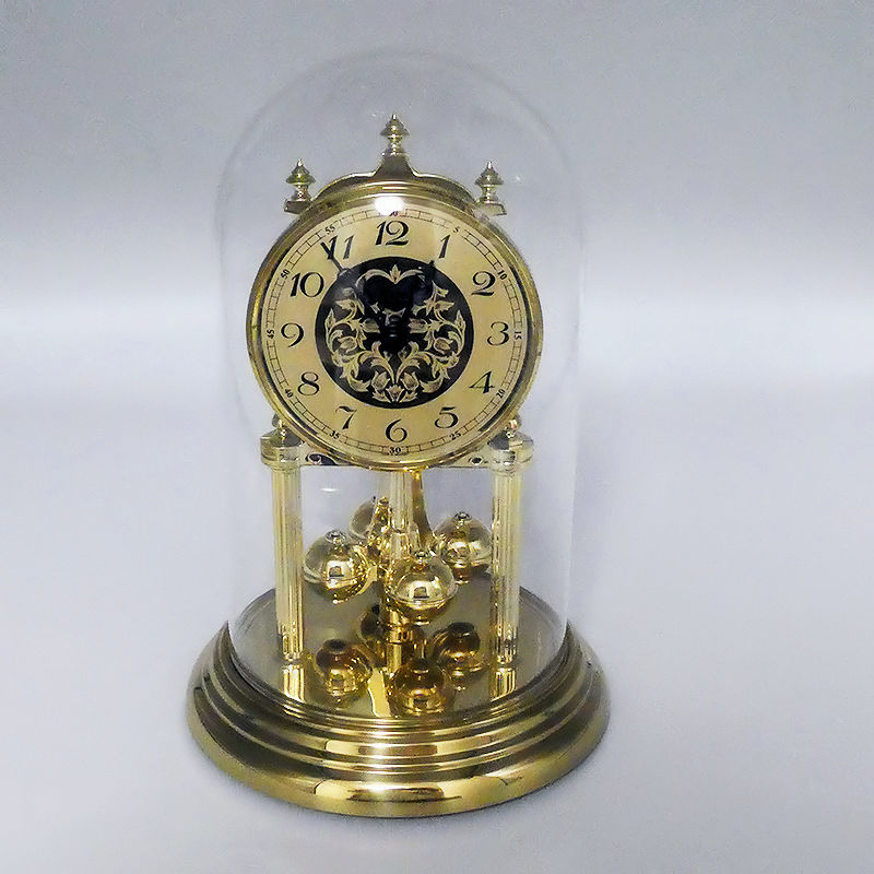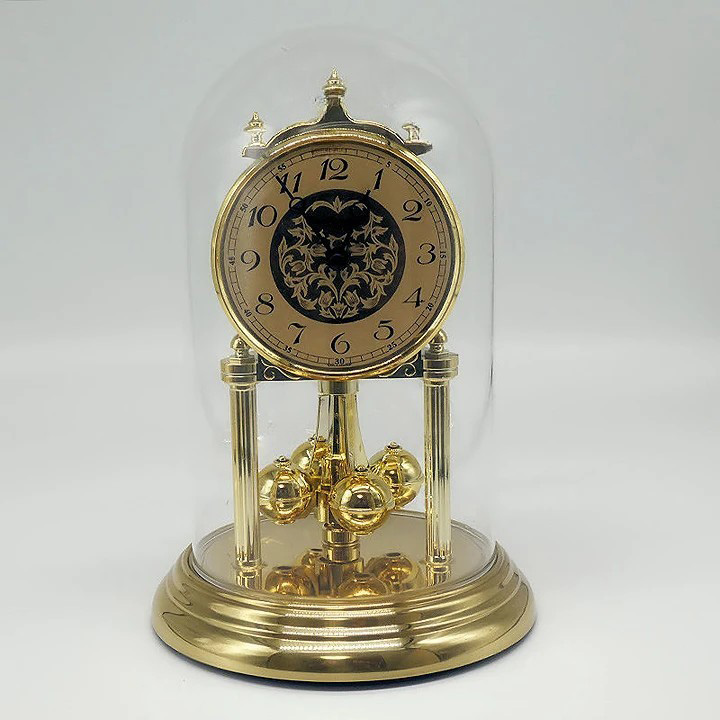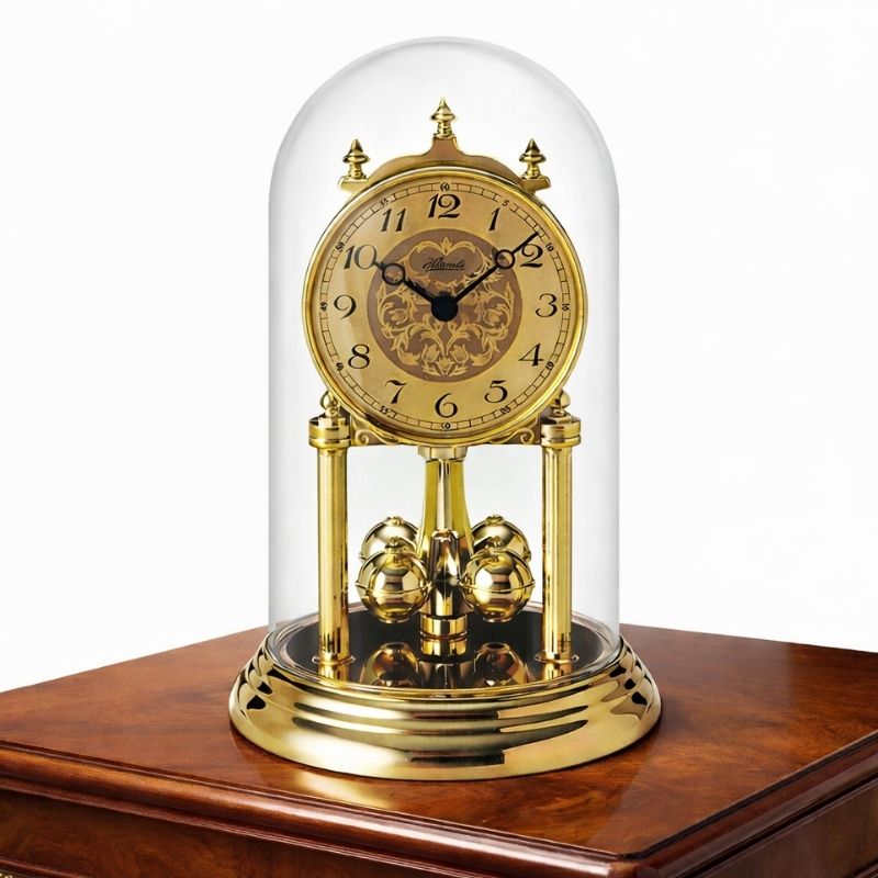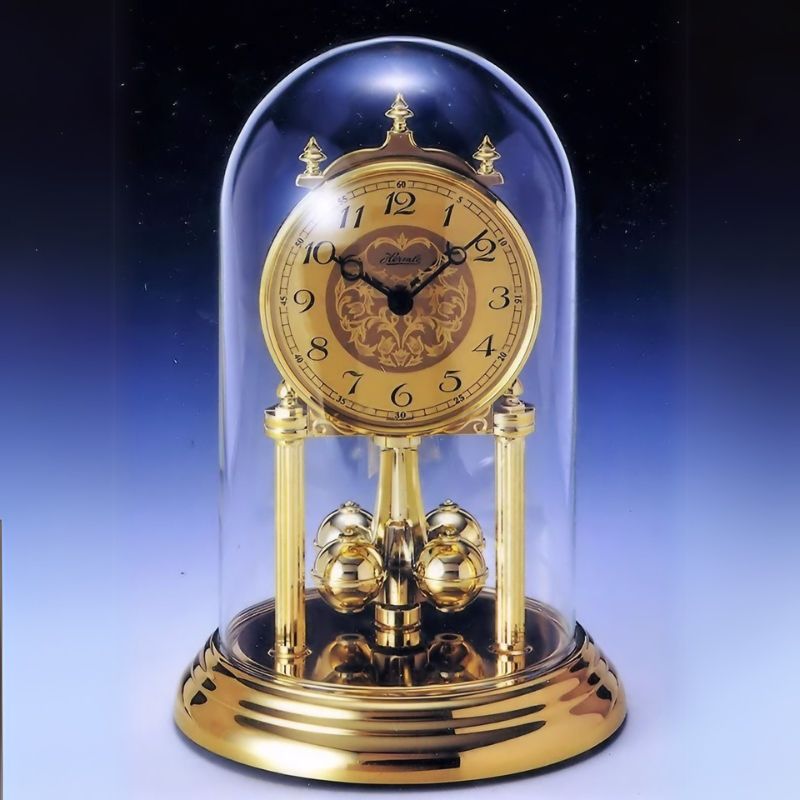 ベースと文字盤に重厚感溢れるメタル素材を贅沢に使用し、精緻な装飾が施されています。それらを優しく包み込む透明なガラス製ドームは、ホコリから大切な時計を守るだけでなく、その美しさを際立たせ、まるで美術館の展示品のような気高い佇まいを演出します。